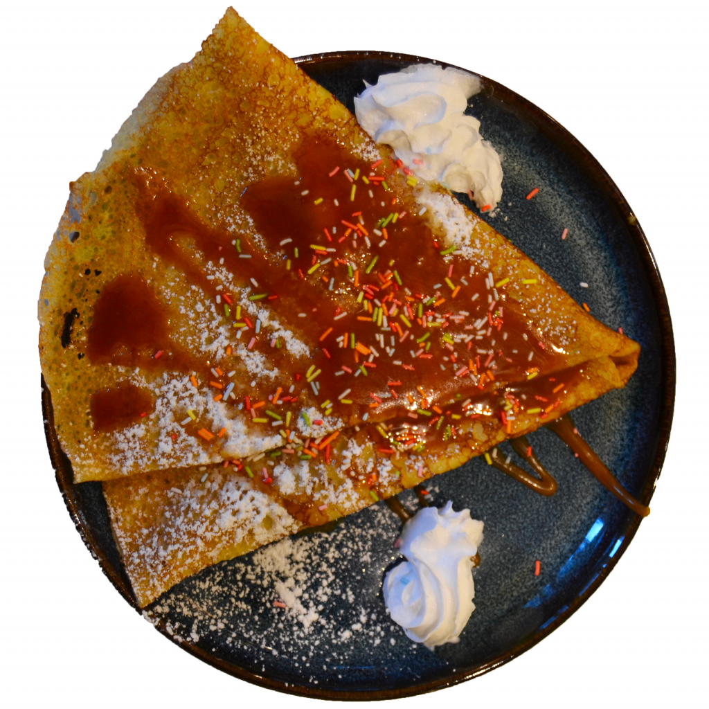Choisissez votre crêpe : chocolat, sucre, caramel beurre salé ou confiture. Sublimez-la avec un supplément de chantilly !